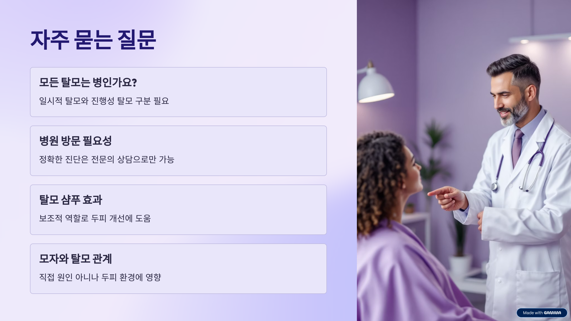 A. 아닙니다. 스트레스나 계절 변화로도 빠질 수 있어요. 하지만 3개월 이상 지속되면 반드시 체크해야 합니다.